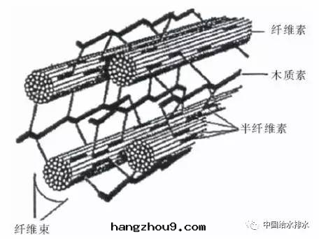 手(shǒu)紙(zhǐ),再加上(shàng)厨餘殘渣、合流制中(zhōng)雜草(cǎo)/樹(shù)叶等構成(chéng)了(le)污水(shuǐ)中(zhōng)總(zǒng)纖維素(學(xué)名(míng)为(wèi)木(mù)質(zhì)纖維素物(wù)質(zhì))。木(mù)質(zhì)纖維素由(yóu)半纖維素(木(mù)糖(táng)、葡萄糖(táng)、半乳糖(táng)、阿拉伯糖(táng)、甘露(lù)糖(táng)以(yǐ)及(jí)它(tā)们(men)的(de)單體(tǐ)衍生(shēng)物(wù))、纖維素(D-吡喃型葡萄糖(táng))和木(mù)質(zhì)素(苯丙烷單元(yuán))組成(chéng)。它(tā)们(men)的(de)分(fēn)子結構與(yǔ)聚合物(wù)的(de)穩定(dìng)聚合狀态是(shì)導致(zhì)这(zhè)類(lèi)物(wù)質(zhì)生(shēng)物(wù)降解(jiě)性(xìng)變(biàn)差的(de)主(zhǔ)要(yào)原因(yīn)。木(mù)質(zhì)纖維素中(zhōng)的(de)三(sān)種(zhǒng)基本(běn)成(chéng)分(fēn)往往並(bìng)不(bù)彼此(cǐ)獨立存在(zài),鍊(liàn)狀纖維素分(fēn)子所(suǒ)組成(chéng)的(de)纖維束(shù)骨(gǔ)架通(tòng)过(guò)半纖維素的(de)联結作(zuò)用(yòng)使得木(mù)質(zhì)素纏绕包(bāo)裹在(zài)纖維束(shù)周圍,形成(chéng)整體(tǐ)結構致(zhì)密穩定(dìng)的(de)複雜聚合物(wù),如图(tú)1所(suǒ)示。